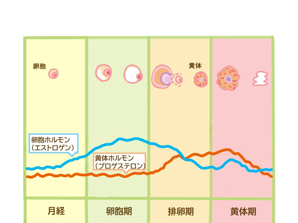 まず、生理のメカニズムとしては、エストロゲン(卵胞ホルモン)とプロゲステロン(黄体ホルモン)の2つの女性ホルモンがあります。