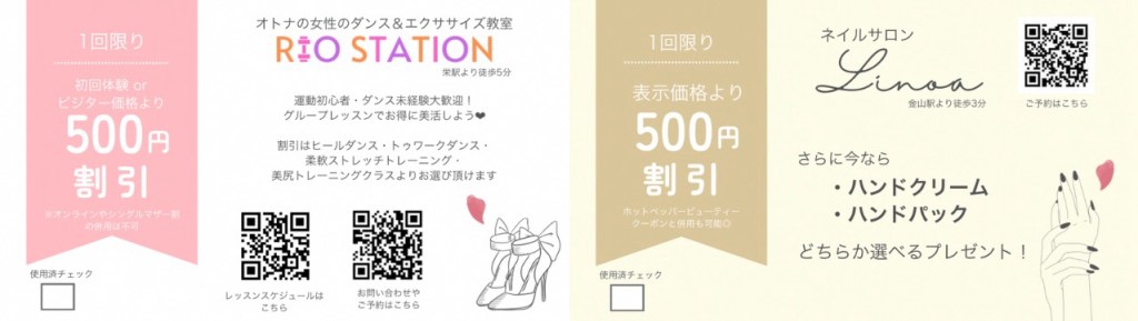 初回体験を含むレッスンを受講した方限定で、次回使えるレッスン割引とネイル割引の両方使えるクーポンを配布しております。